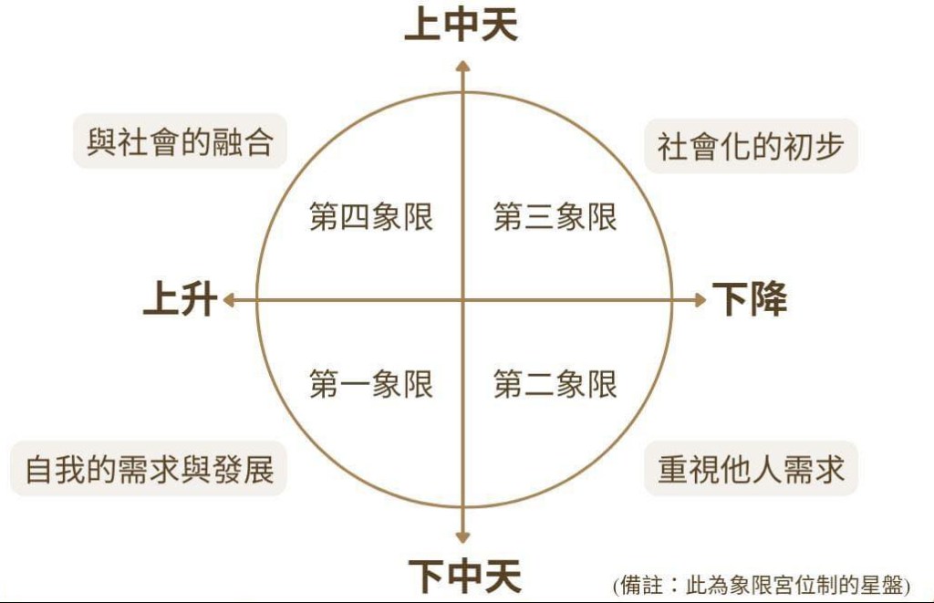 內容:四軸點為上升、下降、上中天,下中天,四個象限分別是依據兩軸線所劃分,如圖所示: