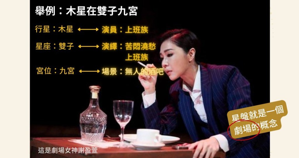 行星是名詞,是主要的人事物象徵,或說演員,而星座是形容詞,也就是演員們如何演繹自己,或是他們的裝扮如何,表現出什麼姿態,而宮位是場景,就是他們出場的背景,是主要在那些背景出現活躍